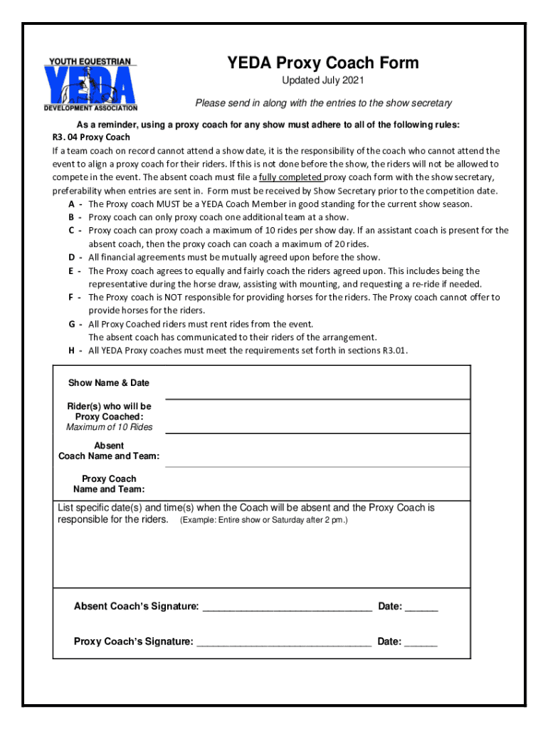 VEDA Proxy Coach Form Updated July 2021 Please send in along with the entries to the show secretary As a reminder, using a proxy coach for any show must adhere to all the following rules:R3. 04 Proxy