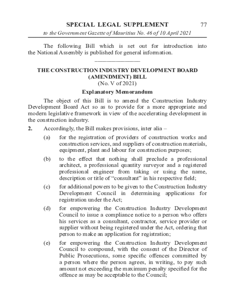 SPECIALLEGALSUPPLEMENT77to the Government Gazette of Mauritius No. 46 of 10 April 2021The following Bill which is set out for introduction into the National Assembly is published for general information.