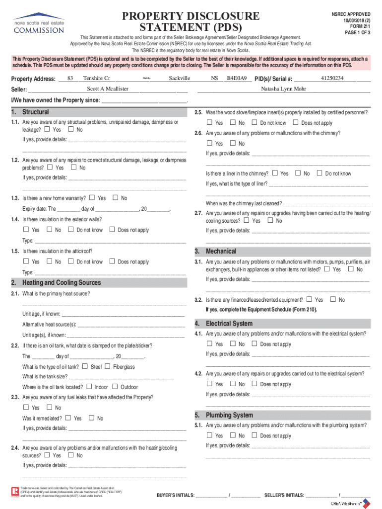 PROPERTY DISCLOSURE STATEMENT (PDS) This Statement is attached to and forms part of the Seller Brokerage Agreement/Seller Designated Brokerage Agreement. Approved by the Nova Scotia Real Estate Commission