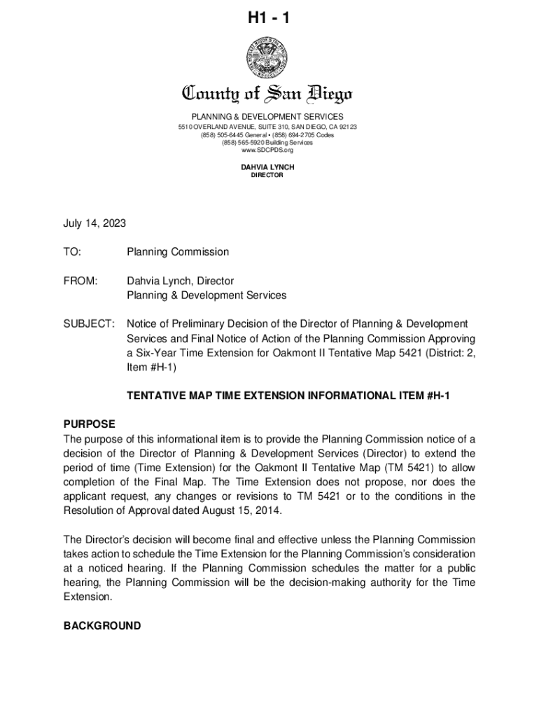 H1 1PLANNING & DEVELOPMENT SERVICES 5510 OVERLAND AVENUE, SUITE 310, SAN DIEGO, CA 92123 (858) 5056445 General (858) 6942705 Codes (858) 5655920 Building Services www.SDCPDS.orgDAHVIA LYNCH DIRECTOR