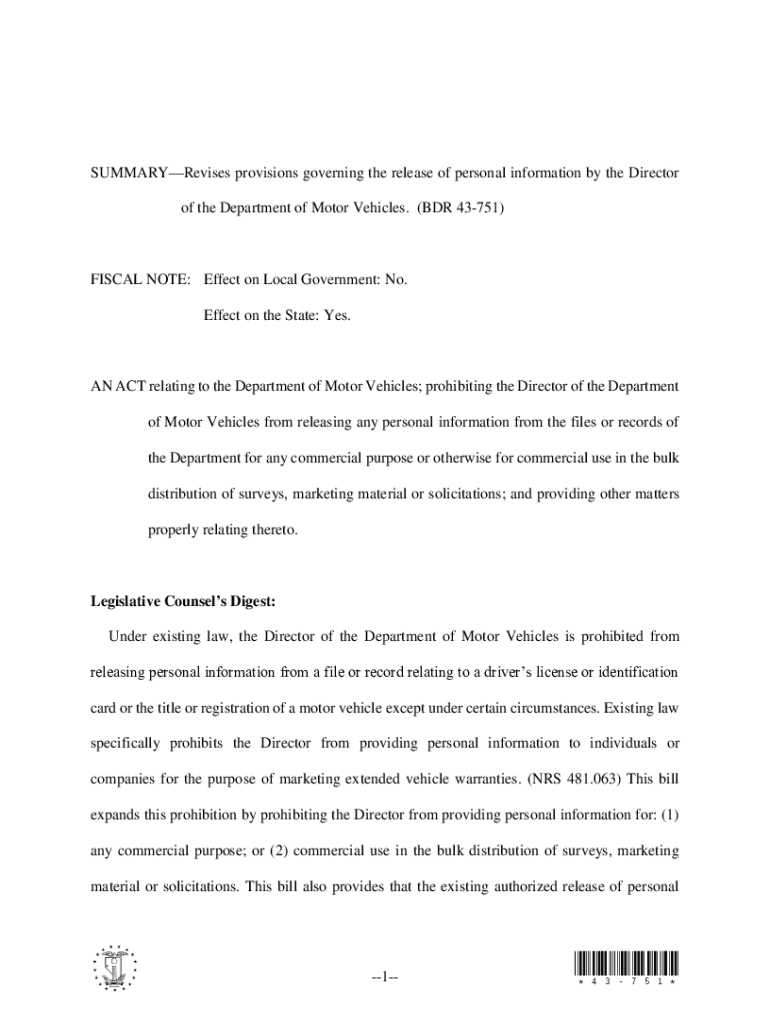 SUMMARYRevises provisions governing the release of personal information by the Director of the Department of Motor Vehicles. (BDR 43751)FISCAL NOTE: Effect on Local Government: No. Effect on the State: