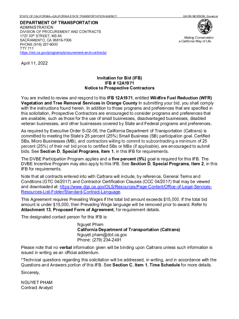 STATE OF CALIFORNIACALIFORNIA STATE TRANSPORTATION AGENCYGAVIN NEWSOM, GovernorDEPARTMENT OF TRANSPORTATION ADMINISTRATIONDIVISION OF PROCUREMENT AND CONTRACTS 1727 30th STREET, MS 65 SACRAMENTO,