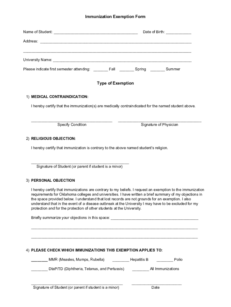 Immunization Exemption Form Name of Student: ___Date of Birth: ___Address: ___ ___ University Name: ___ Please indicate first semester attending: ___ Fall___ Spring___ Summer of Exemption 1) MEDICAL