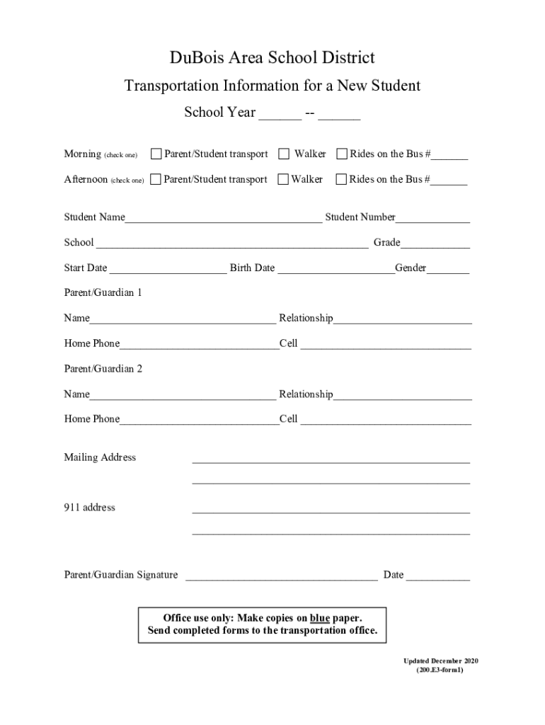 Parents or legal guardians of students who require transportation services are required to file the new student transportation formdocx.