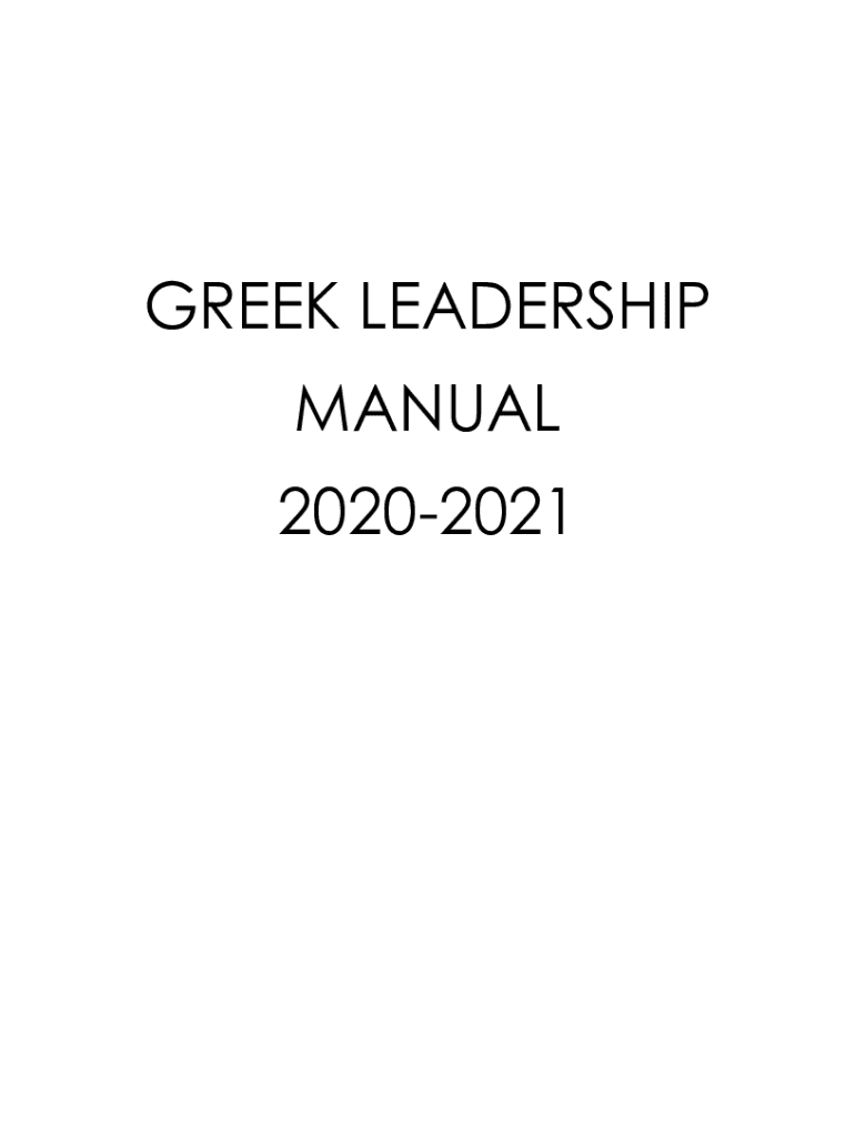 GREEK LEADERSHIP MANUAL 20202021TABLE OF CONTENTS I. General Information pg. 3II. Important 20202021 Dates for Greek Leaders pg. 5III. The Pillars Program pg. 7IV. Greek Awards Nomination Packet pg.