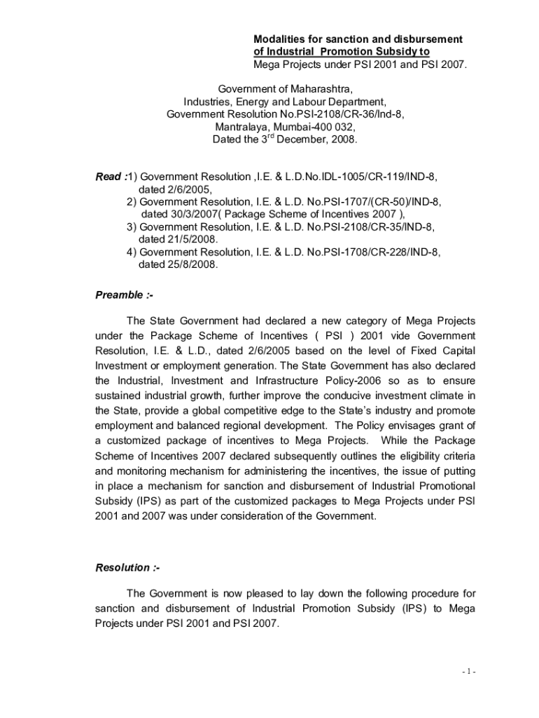 Modalities for sanction and disbursement of Industrial Promotion Subsidy to Mega Projects under PSI 2001 and PSI 2007. Government of Maharashtra, Industries, Energy and Labor Department, Government