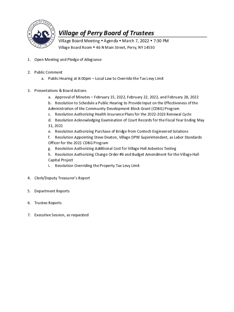 Village of Perry Board of Trustees Village Board Meeting Agenda March 7, 2022 7:30 PM Village Board Room 46 N Main Street, Perry, NY 14530 1. Open Meeting and Pledge of Allegiance 2. Public Comment