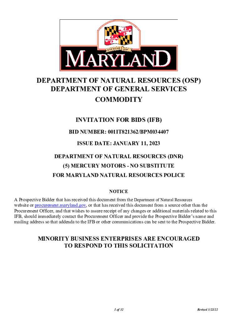 DEPARTMENT OF NATURAL RESOURCES (DSP) DEPARTMENT OF GENERAL SERVICES COMMODITY INVITATION FOR BIDS (IF) BID NUMBER: 001IT821362/BPM034407 ISSUE DATE: JANUARY 11, 2023, DEPARTMENT OF NATURAL RESOURCES