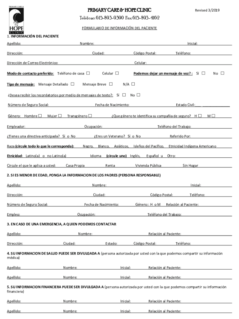 PRIMARY CARE & HOPE CLINICRevised 3/2019Telfono: 6158939390 Fax: 6158934162