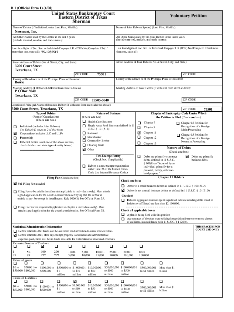 B 1 (Official Form 1) (1/08)United States Bankruptcy Court Eastern District of Texas Sherman Name of Debtor (if individual, enter Last, First, Middle):Voluntary Petition Name of Joint Debtor (Spouse)