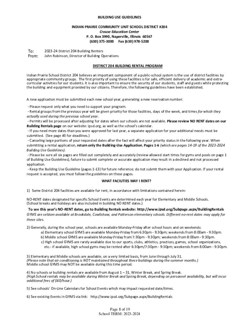 BUILDING USE GUIDELINES INDIAN PRAIRIE COMMUNITY UNIT SCHOOL DISTRICT #204 Grouse Education Center P. O. Box 3990, Naperville, Illinois 60567 (630) 3753000 Fax (630) 9785200 To: From:202324 District