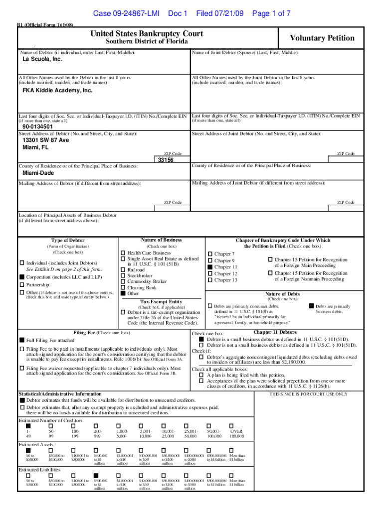 Case 0924867LMIDoc 1Filed 07/21/09Page 1 of 7B1 (Official Form 1)(1/08)United States Bankruptcy CourtVoluntary PetitionSouthern District of Florida