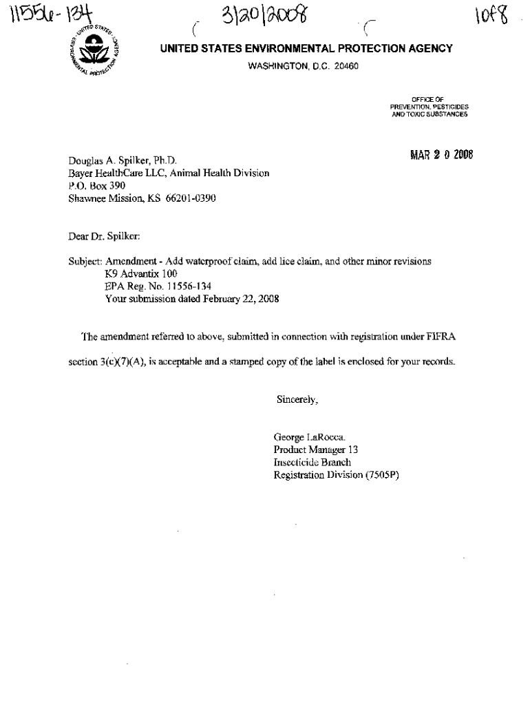 Ok(UNITED STATES ENVIRONMENTAL PROTECTION AGENCY WASHINGTON, D.C. 20460OFFICE OF PREVENTION. PESTICIDES AND TOXIC SUBSTANCES MAR 2 0 2008Douglas A. Silver, Ph.D. Bayer Healthcare LLC, Animal Health