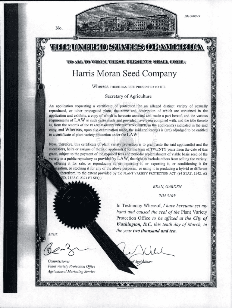 201000079No. Harris Moran Seed Company Whereas, THERE HAS BEEN PRESENTED TO THE Secretary of Agriculture An application requesting a certificate of protection for an alleged distinct variety of sexually