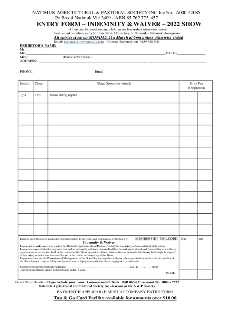 NATICK AGRICULTURAL & PASTORAL SOCIETY INC No. A0005208S Po Box 4 Natick Vic 3409 ABN 85 762 775 457ENTRY FORM INDEMNITY & WAIVER 2022 SHOW All entries for members and children are free unless otherwise