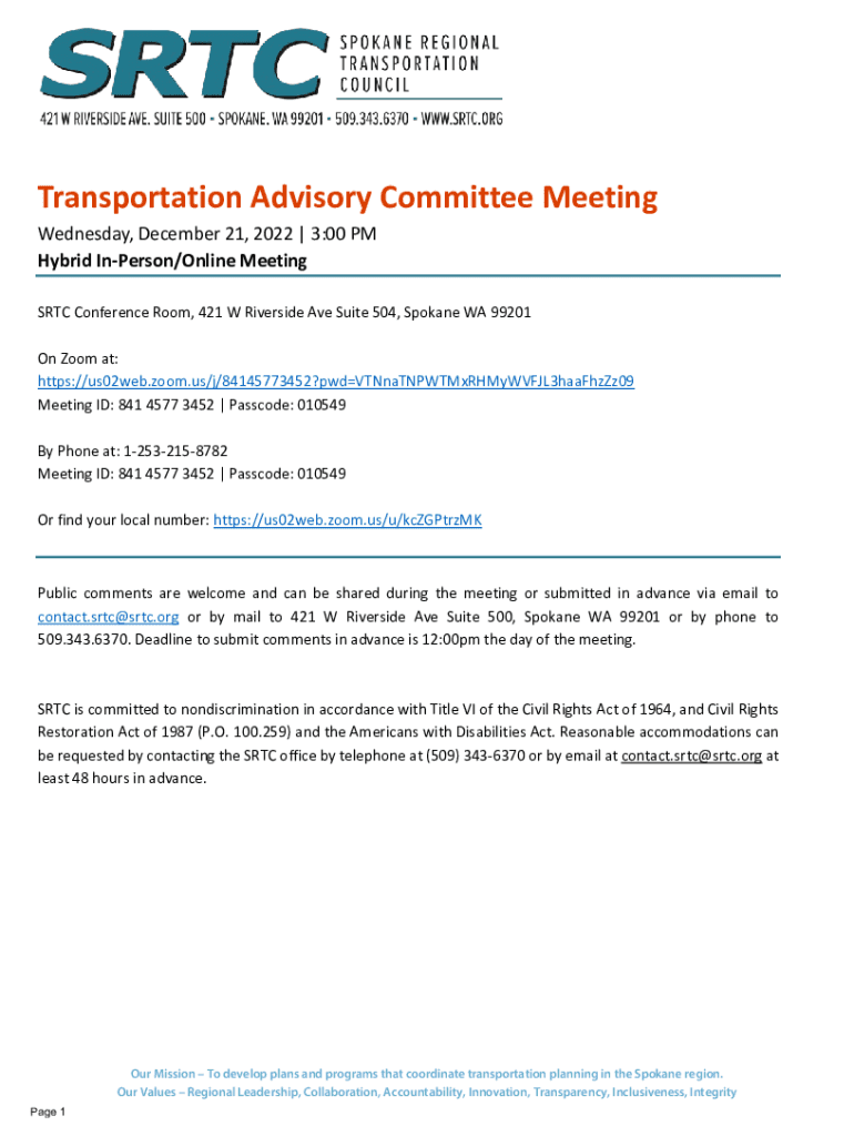 Transportation Advisory Committee Meeting Wednesday, December 21, 2022 | 3:00 PM Hybrid Unperson/Online Meetings RTC Conference Room, 421 W Riverside Ave Suite 504, Spokane WA 99201 On Zoom at: https://us02web.zoom.us/j/84145773452?pwdVTNnaTNPWTMxRHMyWVFJL3haaFhzZz09