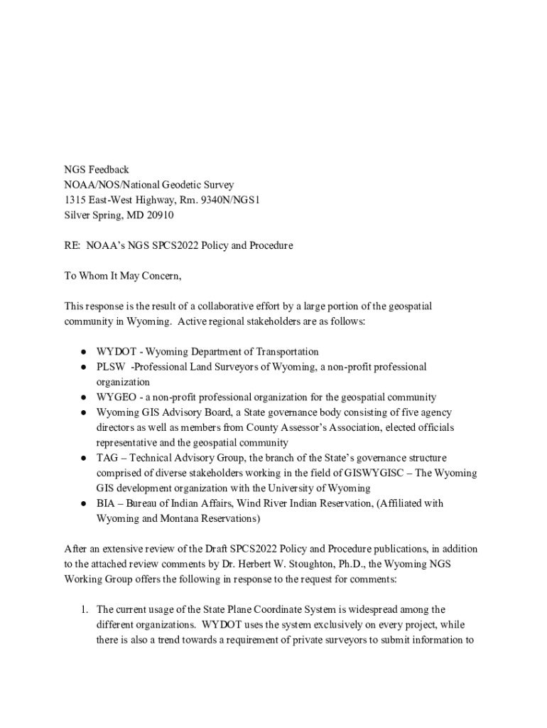 NGS Feedback NOAA/NOS/National Geodetic Survey 1315 East West Highway, Rm. 9340 N/NGS1 Silver Spring, MD 20910 RE: NOAA NGS SPCS2022 Policy and Procedure To Whom It May Concern, This response is