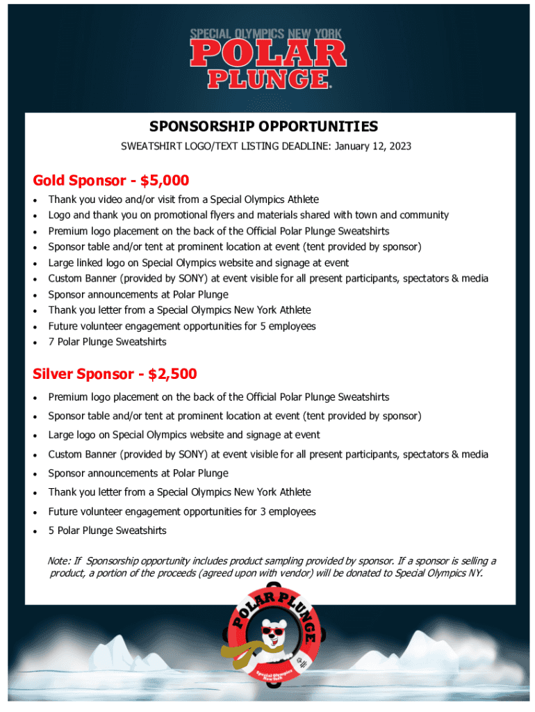 SPONSORSHIP OPPORTUNITIES SWEATSHIRT LOGO/TEXT LISTING DEADLINE: January 12, 2023Gold Sponsor $5,000 Thank you video and/or visit from a Special Olympics AthleteLogo and thank you on promotional flyers