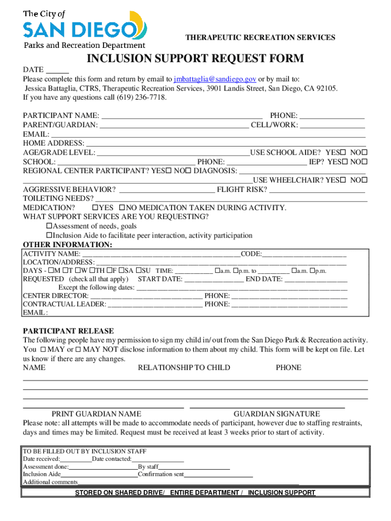 THERAPEUTIC RECREATION SERVICESINCLUSION SUPPORT REQUEST FORM DATE Please complete this form and return by email to jmbattaglia@sandiego.gov or by mail to: Jessica Battalion, CARS, Therapeutic Recreation