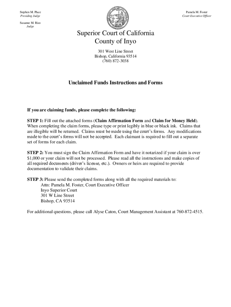 Stephen M. Place Presiding Judge Pamela M. Foster Court Executive Officer Susanne M. Rico Judge Superior Court of California County of Into 301 West Line Street Bishop, California 93514 (760) 8723038Unclaimed