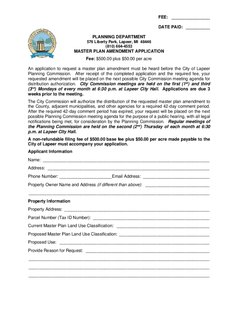 FEE: ___ DATE PAID: ___ PLANNING DEPARTMENT 576 Liberty Park, La peer, MI 48446 (810) 6644553MASTER PLAN AMENDMENT APPLICATION Fee: $500.00 plus $50.00 per acre An application to request a master