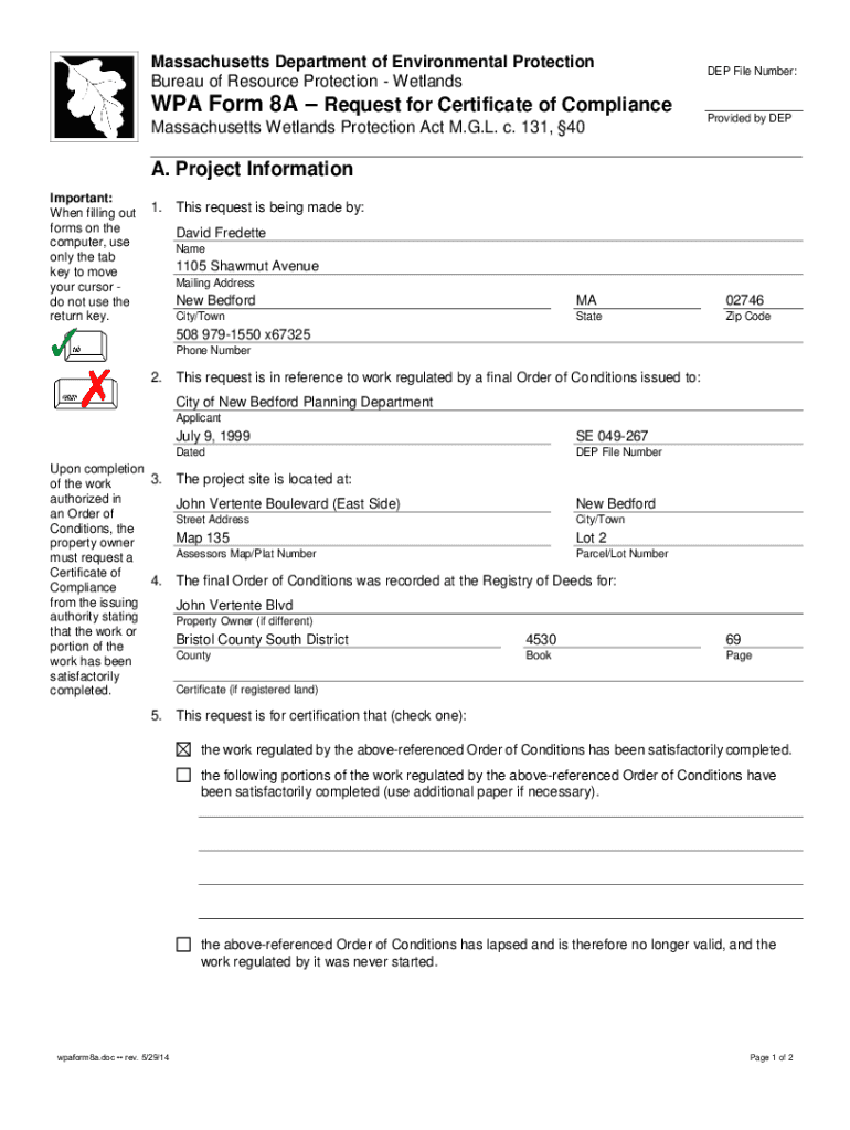 Massachusetts Department of Environmental Protection Bureau of Resource Protection Wetlands WPA Form 8A Request for Certificate of Compliance Massachusetts Wetlands Protection Act M.G.L. c. 131, 40DEP