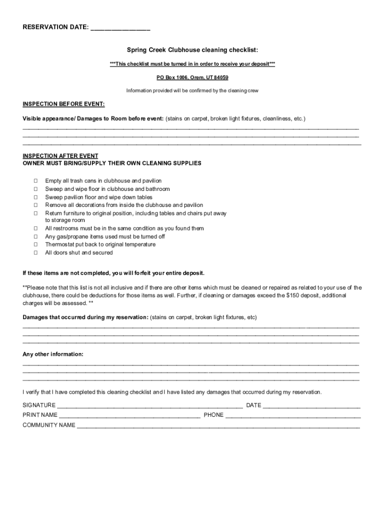 RESERVATION DATE: ___ Spring Creek Clubhouse cleaning checklist: ***This checklist must be turned in order to receive your deposit*** PO Box 1006, Orem, UT 84059 Information provided will be confirmed