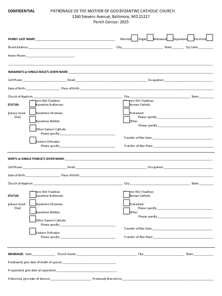 CONFIDENTIALPATRONAGE OF THE MOTHER OF GOD BYZANTINE CATHOLIC CHURCH 1260 Stevens Avenue, Baltimore, MD 21227 Parish Census: 2023FAMILY LAST NAME:___ Street Address:___Married:___ Single:___ Widowed:___