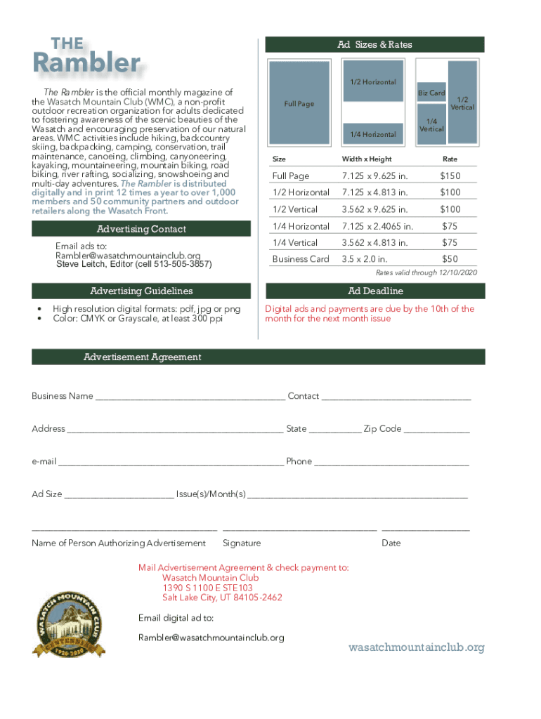 THERamblerAd Sizes & Rates Rambler is the official monthly magazine of the Wasatch Mountain Club (BMC), a nonprofit outdoor recreation organization for adults dedicated to fostering awareness of the