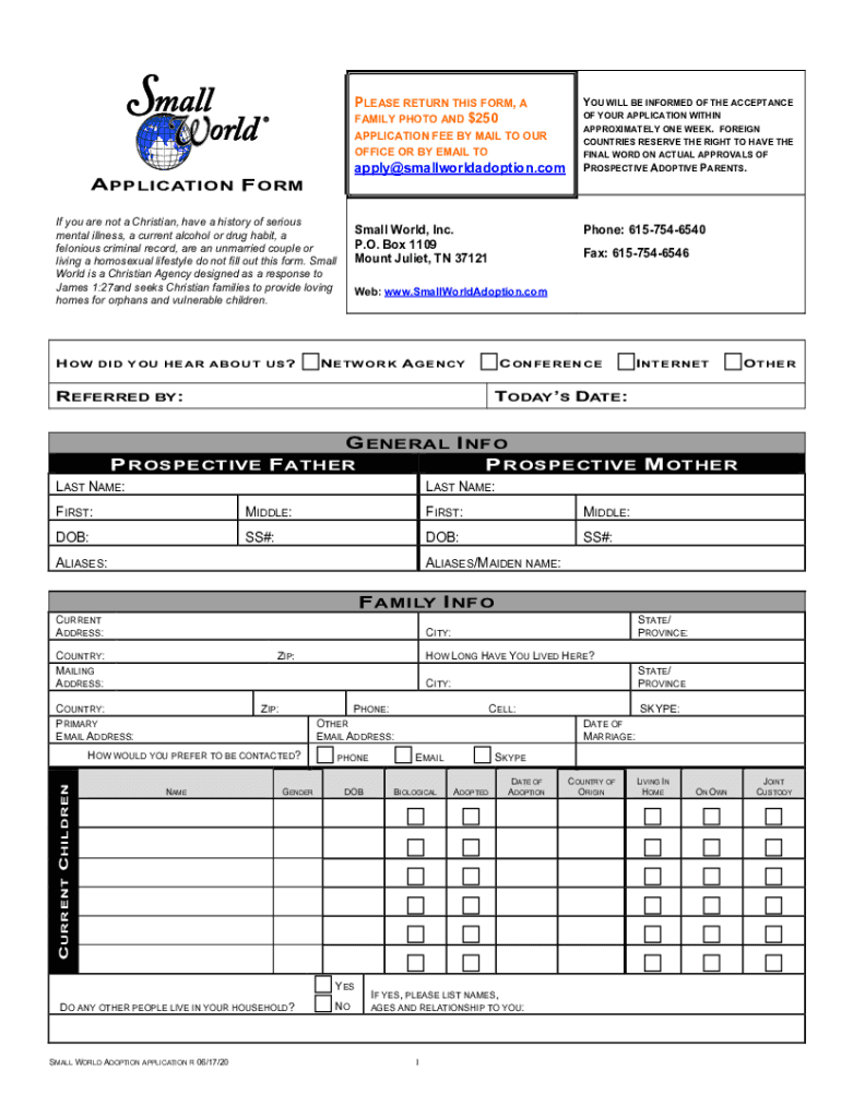 PLEASE RETURN THIS FORM, A FAMILY PHOTO AND $250 APPLICATION FEE BY MAIL TO OUR OFFICE OR BY EMAIL TOapply@smallworldadoption.comA APPLICATION F ORM If you are not a Christian, have a history of serious