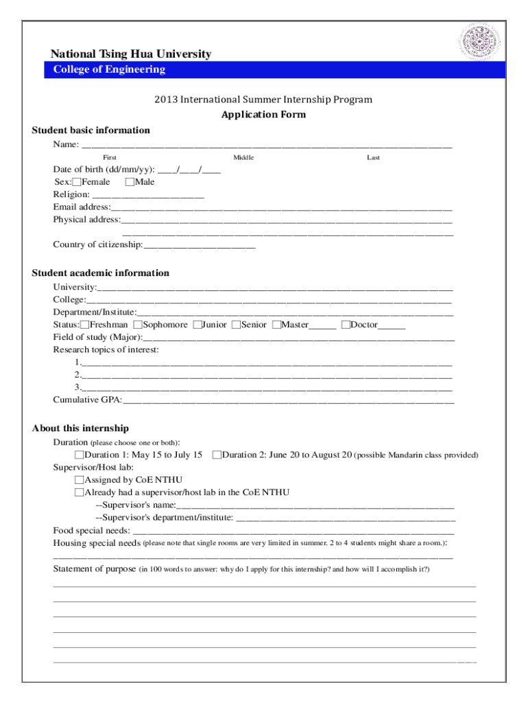 Get the free Taiwan National Tsing Hua UniversitySummer Research ... - news num edu
