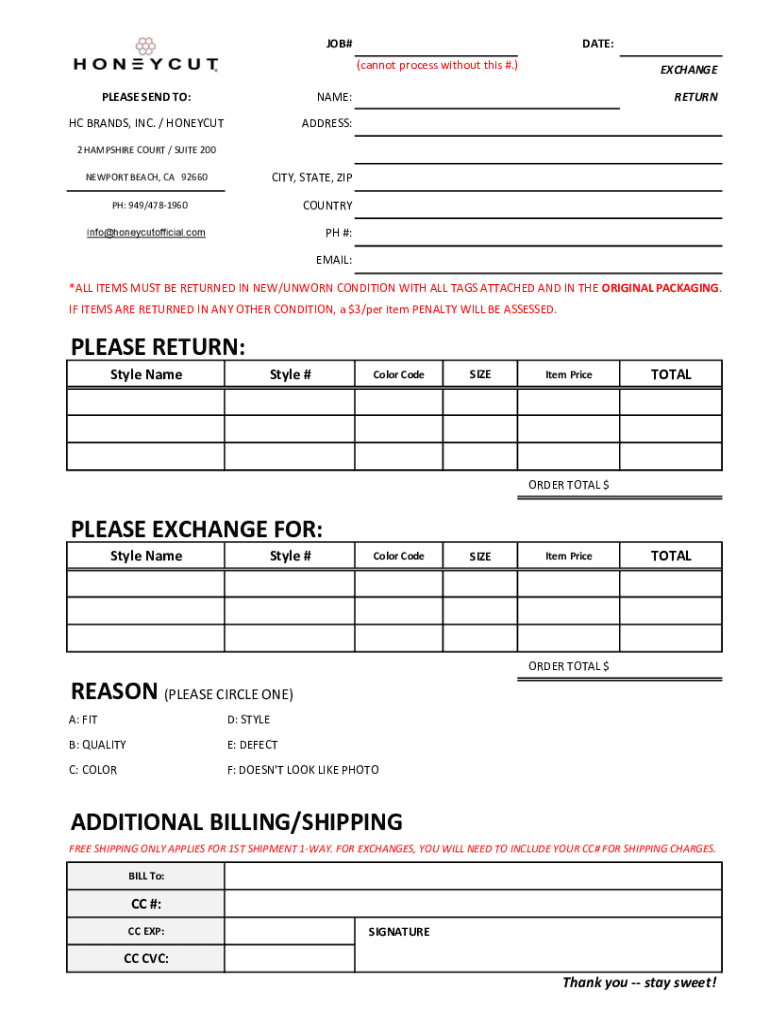 (cannot process without this #.)PLEASE SEND TO:EXCHANGEABLE:HC BRANDS, INC. / HONEYCUTRETURNADDRESS:2 HAMPSHIRE COURT / SUITE 200CITY, STATE, NEWPORT BEACH, CA 92660COUNTRYPH: 949/4781960