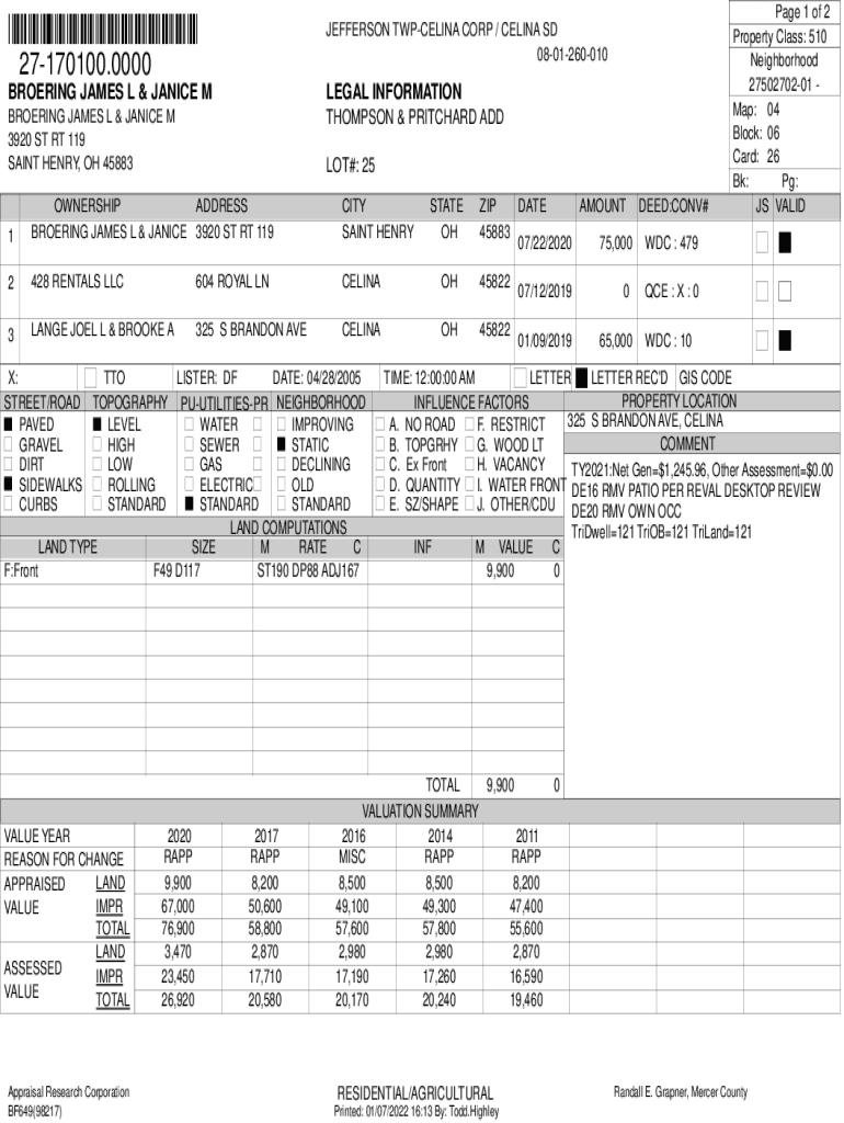 *271701000000×JEFFERSON CELINA CORP / CELINA SD 0801260010BROERING JAMES L & JANICE LEGAL INFORMATIONBROERING JAMES L & JANICE M 3920 ST RT 119 SAINT HENRY, OH 45883THOMPSON & PRITCHARD ADD27170100.0000LOT#:
