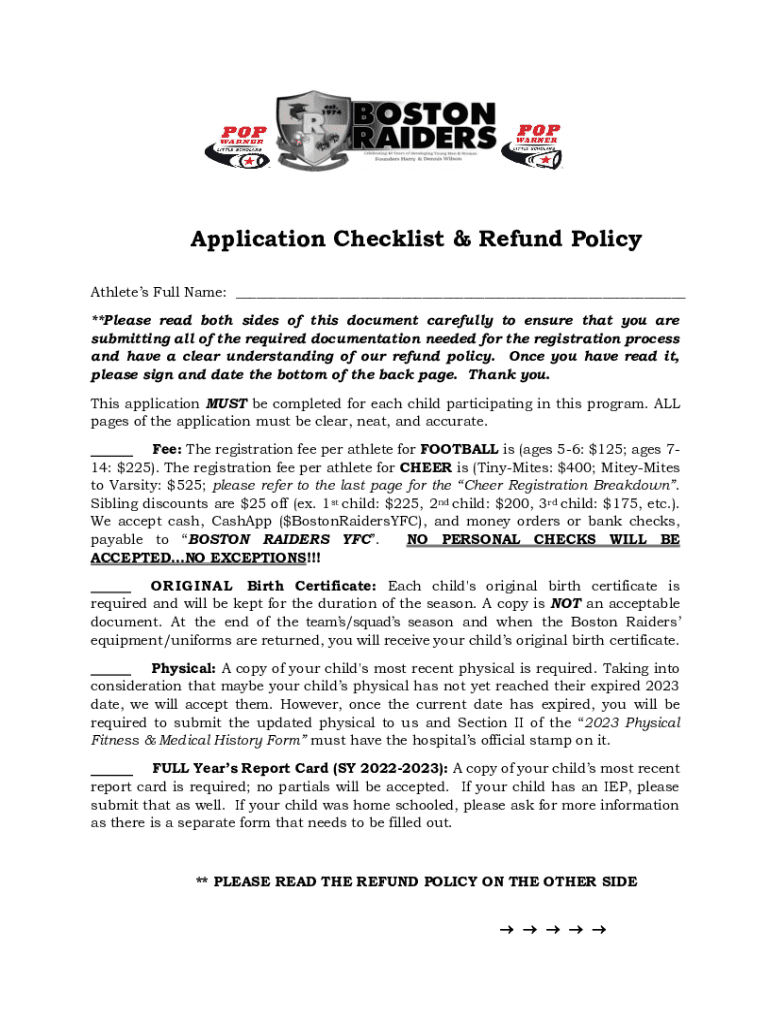 Application Checklist & Refund Policy Athletes Full Name: ___ **Please read both sides of this document carefully to ensure that you are submitting all the required documentation needed for the registration