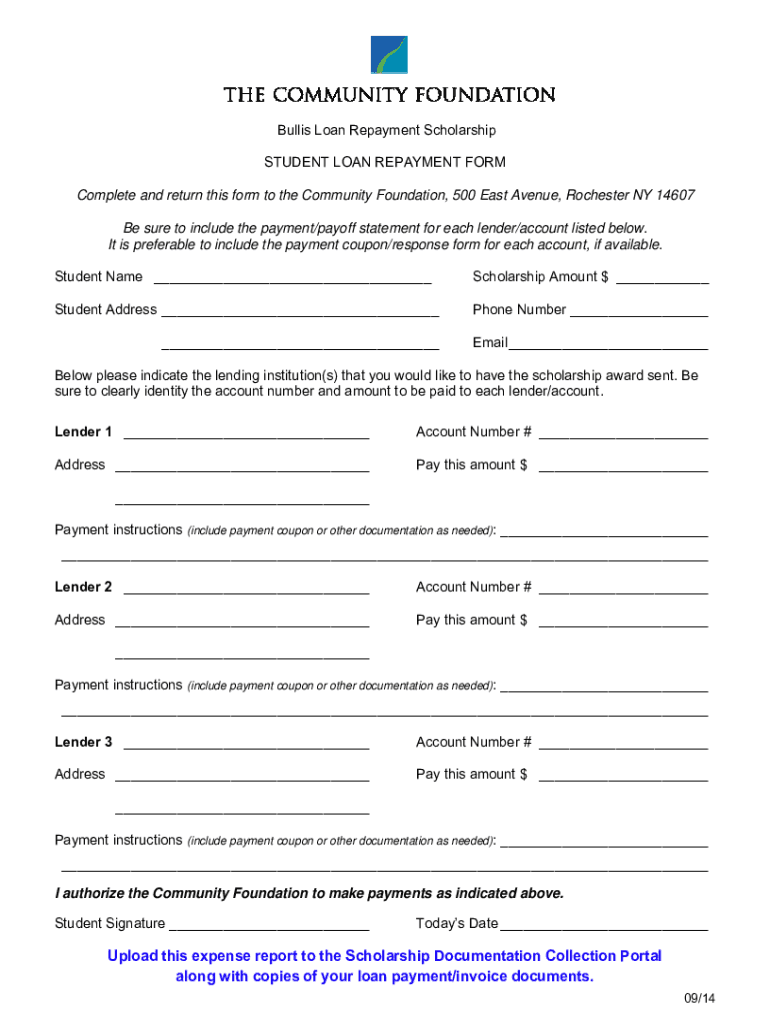 Bulls Loan Repayment Scholarship STUDENT LOAN REPAYMENT FORM Complete and return this form to the Community Foundation, 500 East Avenue, Rochester NY 14607 Be sure to include the payment/payoff statement