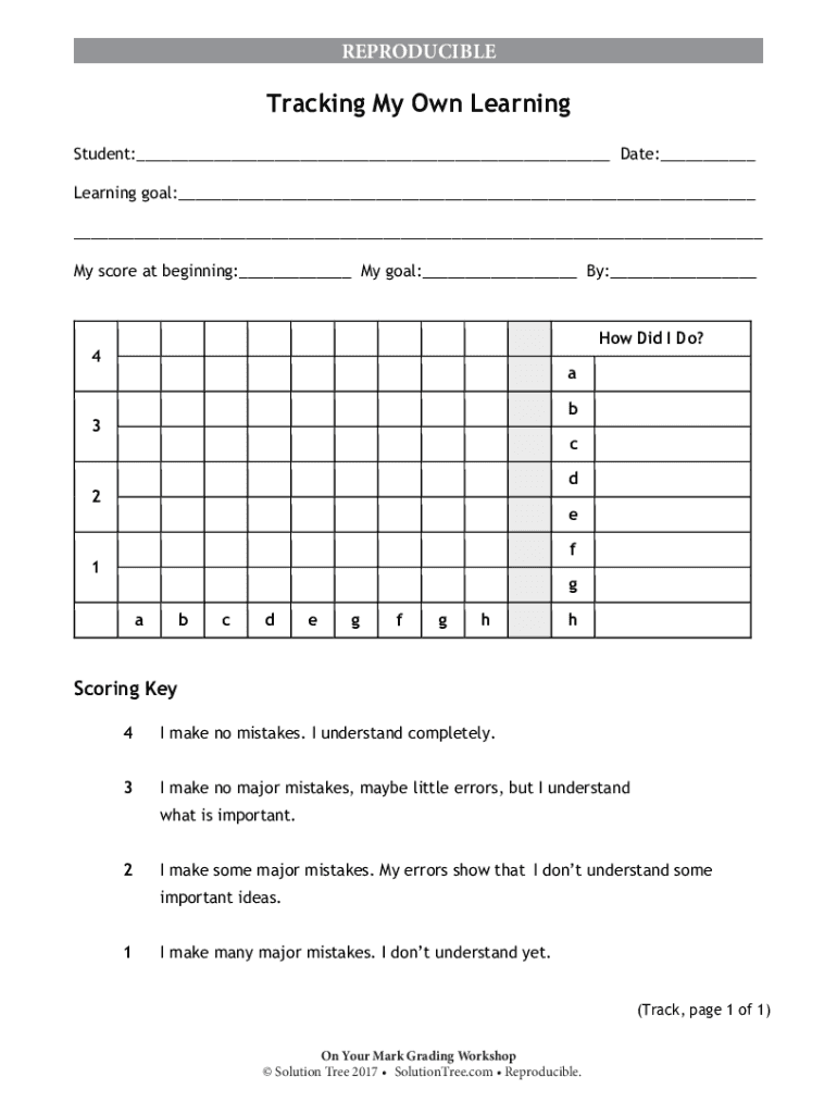REPRODUCIBLETracking My Own Learning Student:___ Date:___ Learning goal:___ ___ My score at beginning:___ My goal:___ By:___How Did I Do?4a b3c d2e f1g abcdegfghhScoring Key 4I make no mistakes. I