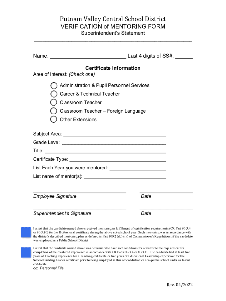 Putnam Valley Central School DistrictVERIFICATION of MENTORING FORM