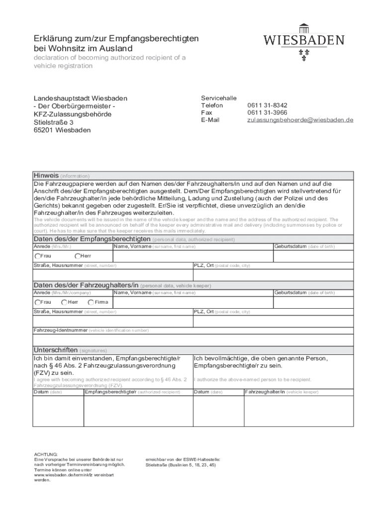 Holen Sie sich kostenlos Erklrung zum/zur Empfangsberechtigten bei Wohnsitz im ...