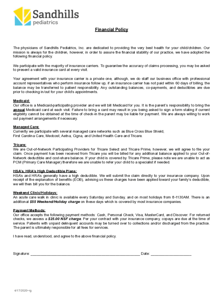 Financial Police physicians of Sand hills Pediatrics, Inc. are dedicated to providing the very best health for your child/children. Our mission is always for the children, however, in order to assure
