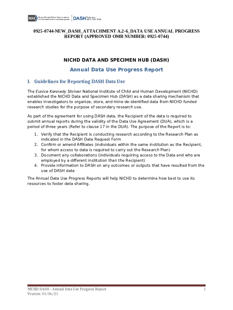 09250744NEW_DASH_ATTACHMENT A.26_DATAUSEANNUAL PROGRESS REPORT (APPROVED OMB NUMBER: 09250744)NICHE DATA AND SPECIMEN HUB (DASH)Annual Data Use Progress Report I. Guidelines for Reporting DASH Data