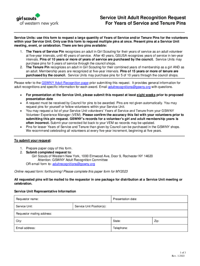 Service Unit Adult Recognition Request For Years of Service and Tenure Pins Service Units: use this form to request a large quantity of Years of Service and/or Tenure Pins for the volunteers within