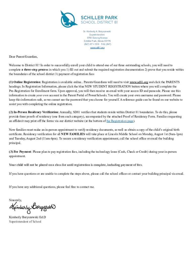 Dr. Kimberly A. Boryszewski Superintendent 9760 Strong Avenue Schiller Park, Illinois 60176 (847) 6711816 FAX (847) www.sd81.orgDear Parent/Guardian, Welcome to District 81! In order to successfully