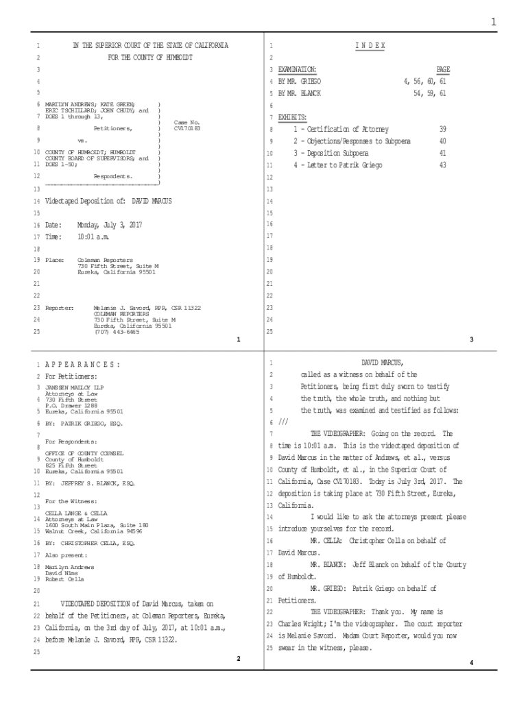1 IN THE SUPERIOR COURT OF THE STATE OF CALIFORNIA FOR THE COUNTY OF HUMBOLDT1 2INDEX1 233 EXAMINATION:4 54 BY MR. GRIEG 5 BY MR. BLANCK6 MARILYN ANDREWS; KATE GREEN; 7 8 9 10 11 12) ERIC SCHILLER;