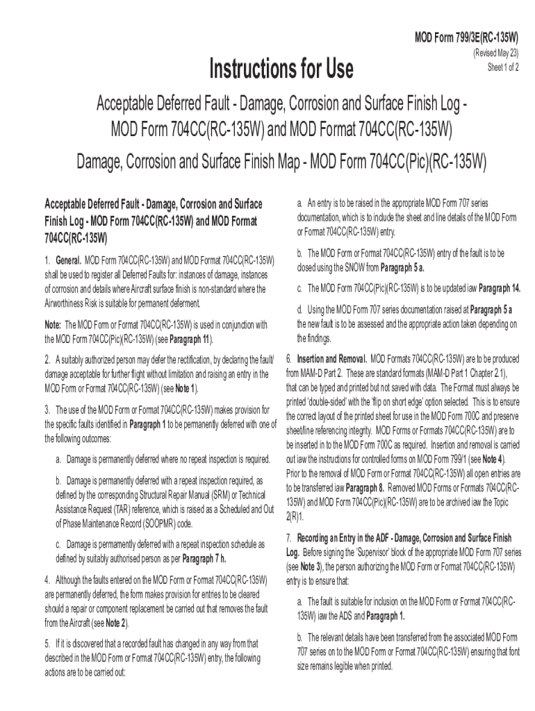 MOD Form 799/3E(RC135W)Instructions for Use(Revised May 23) Sheet 1 of 2Acceptable Deferred Fault Damage, Corrosion and Surface Finish Log MOD Form 704CC(RC135W) and MOD Format 704CC(RC135W) Damage,