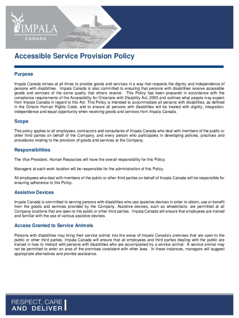 Accessible Service Provision Policy Purpose Impala Canada strives at all times to provide goods and services in a way that respects the dignity and independence of persons with disabilities. Impala