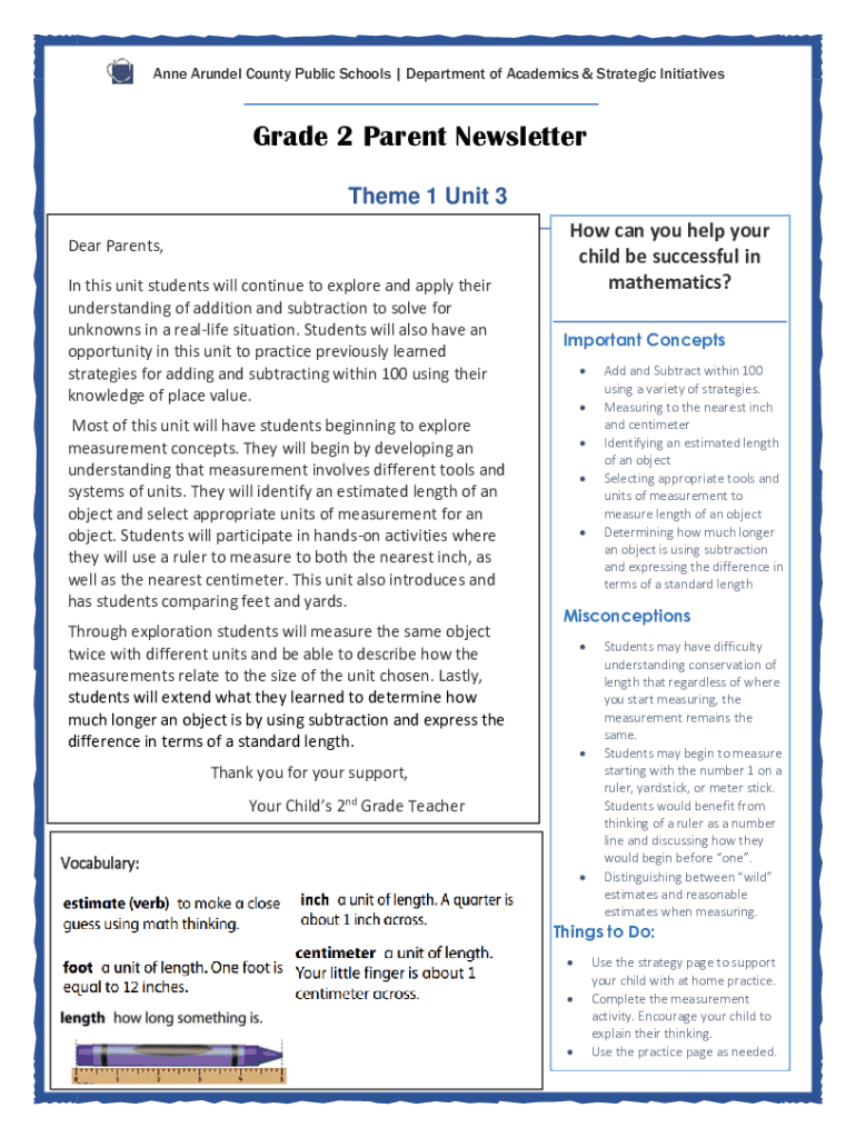 Anne Arundel County Public Schools | Department of Academics & Strategic InitiativesGrade 2 Parent Newsletter Theme 1 Unit 3 Dear Parents, In this unit students will continue to explore and apply