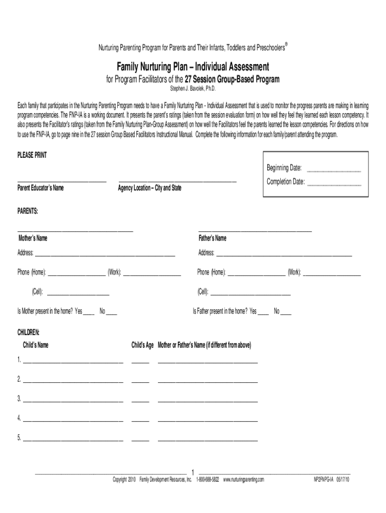 Nurturing Parenting Program for Parents and Their Infants, Toddlers and PreschoolersFamily Nurturing Plan Individual Assessment