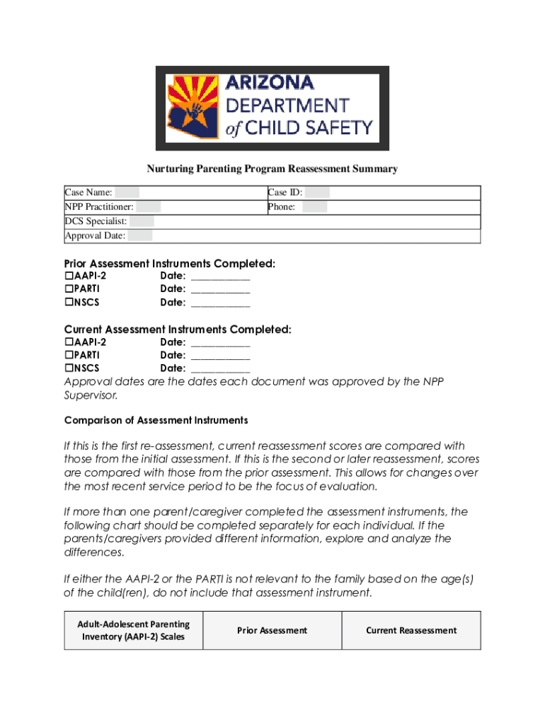 Nurturing Parenting Program Reassessment Summary Case Name: NPP Practitioner: DCS Specialist: Approval Date:Case ID: Phone:Prior Assessment Instruments Completed: AAPI2 PART Escalate: ___ Date: ___