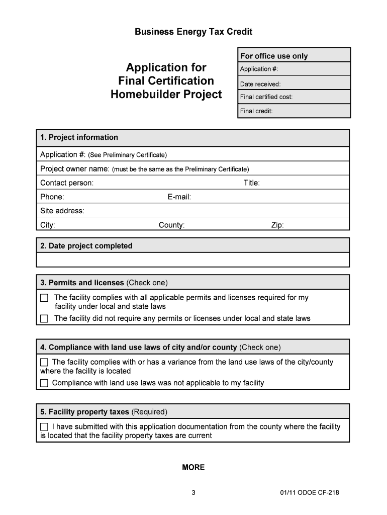 Business Energy Tax Credit Application for Final Certification Home builder Projects 1. When the project is finished, the home builder (project owner) should complete this application. The project