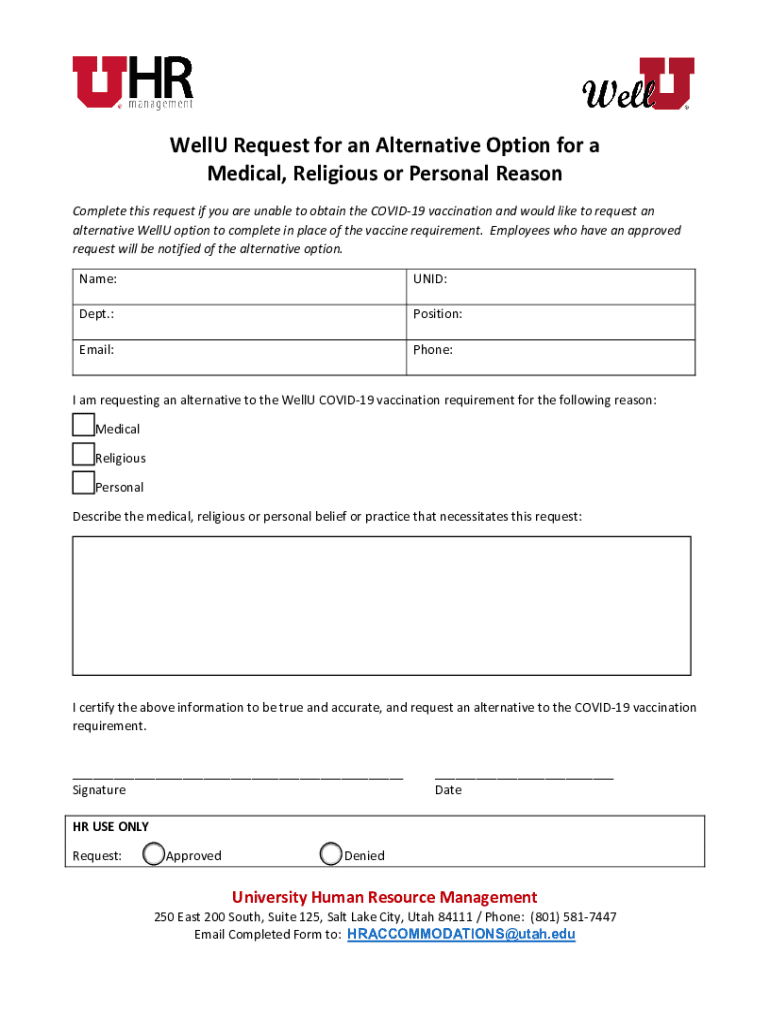Well Request for an Alternative Option for a Medical, Religious or Personal Reason Complete this request if you are unable to obtain the COVID-19 vaccination and would like to request an alternative